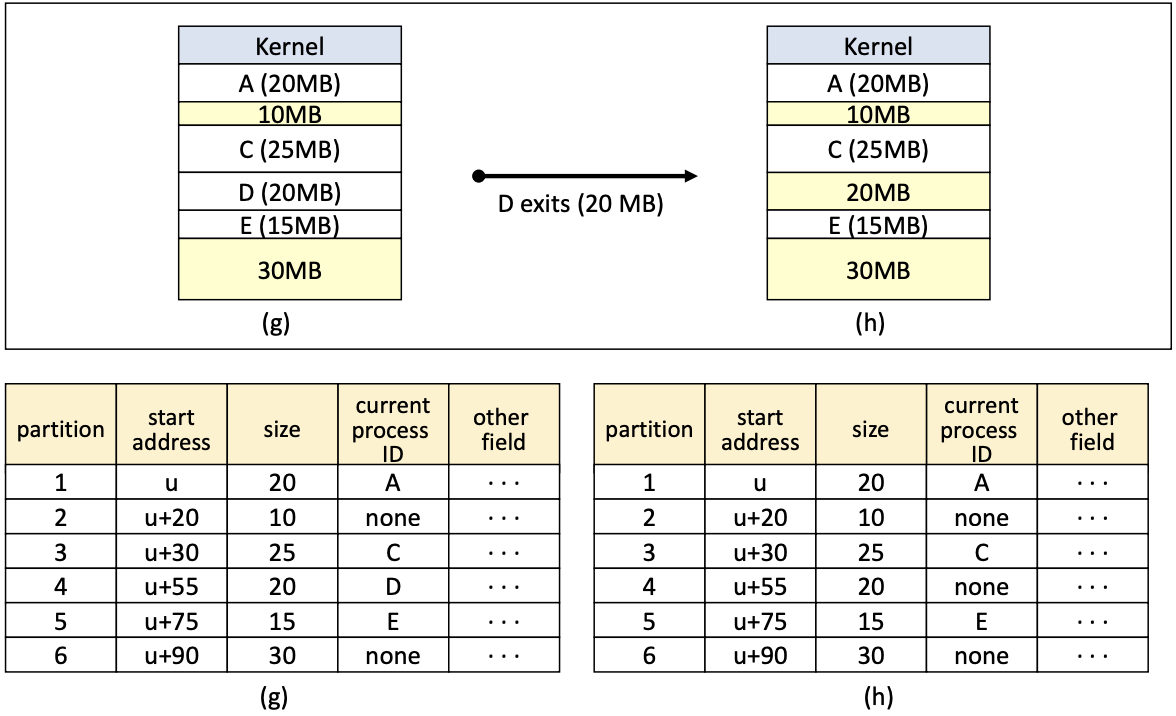 또한, 위의 오른쪽 그림처럼 외부 단편화 문제가 발생할 수도 있다. 이 경우, 인접한 가용 공간을 하나의 가용 공간으로 통합하는